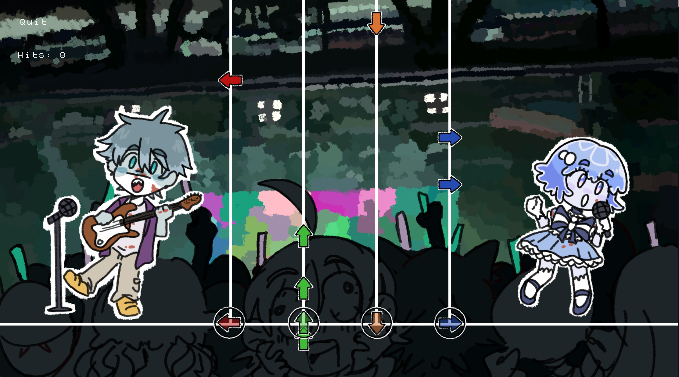I tried playing the game on mobile, but half the text gets cut off by continuing down the window (changed the preferences to fullscreen too, but didn't find a solution) and the first rhythm game was unplayable (the buttons did not react at all to me pressing them). The story is interesting and I love the plot, but I am disappointed I couldn't play it :(