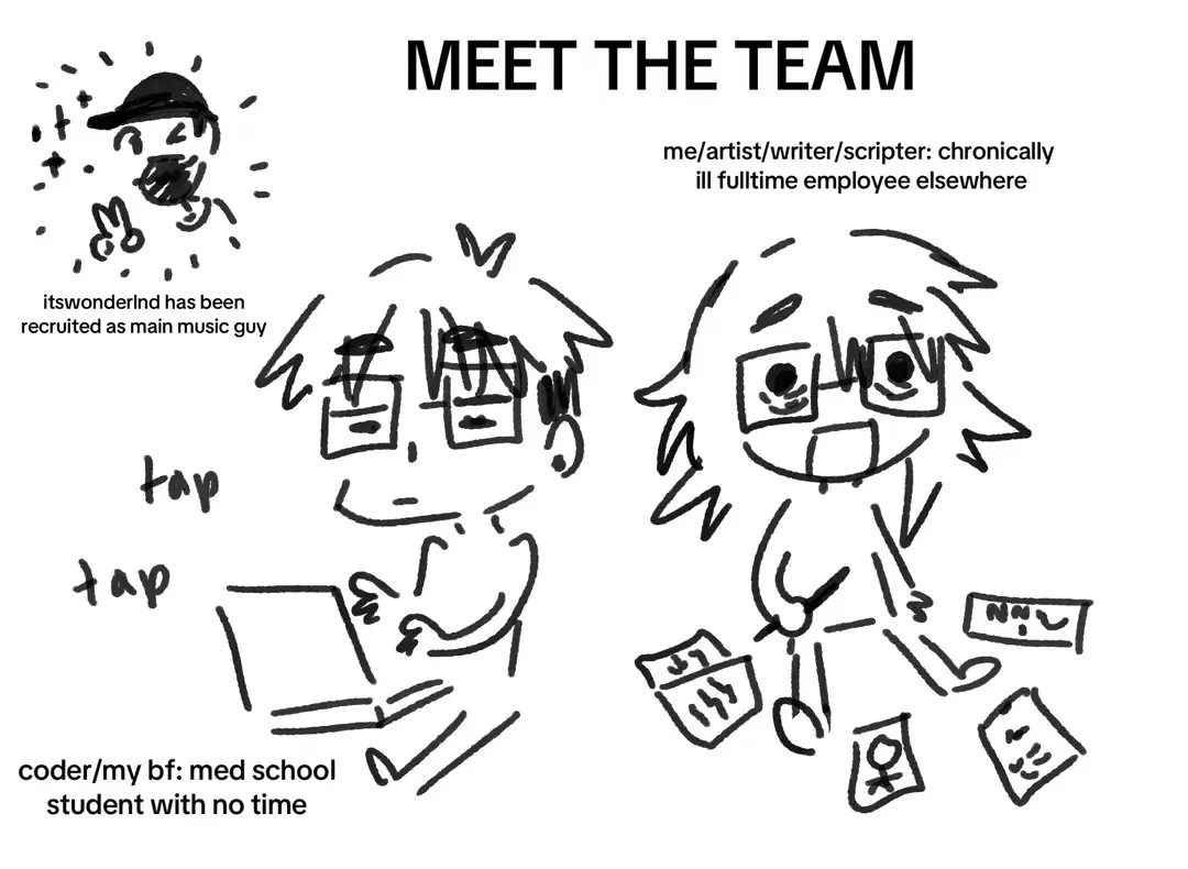 Additonal Credits: One Man Symphony - Music, WOW Sound - Music/SFX, jhonwanderjose - Music, Wattson - Kinetic Text , dmochas-assets - Text Bleeps, r3dhummingbird - Rhythm Game Template, essrenpytutorials - Hidden Object and Clicker Template, Additional Sounds From - Pixabay